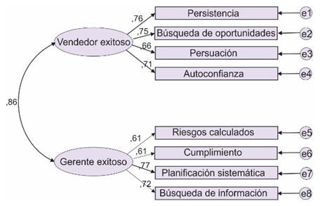 Las conductas vinculadas al perfil de vendedor exitoso incluyeron: persistencia, búsqueda de oportunidades, persuasión y autoconfianza. Estas conductas mostraron cargas factoriales elevadas (entre 0,66 y 0,76), lo que evidencia una correlación significativa con un pensamiento empresarial orientado a la venta y al cierre de negocios. Por otro lado, el perfil de gerente exitoso se relacionó con conductas como toma de riesgos calculados, cumplimiento, planificación sistemática y búsqueda de información, con cargas factoriales también significativas (entre 0,61 y 0,77). La Figura 1 detalla el modelo de medición de estas asociaciones y muestra una alta correlación entre los dos perfiles (r = 0,86), lo cual sugiere que, aunque distintos en su enfoque, ambos tipos de pensamiento empresarial coexisten en los estudiantes analizados.