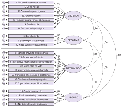 En este estudio se validaron las conductas emprendedoras más relevantes en el comportamiento empresarial de los estudiantes universitarios para reorientar el currículo hacia una formación integral alineada con las motivaciones planteadas por McClelland: logro, afiliación y poder. Para ello, se aplicó un Análisis Factorial Exploratorio (AFE) sobre una muestra representativa, cumpliendo con los supuestos de normalidad multivariante mediante la prueba de Mardia y la prueba de Kaiser-Meyer-Olkin (KMO), obteniendo valores superiores al umbral de 0,70. Se utilizó el método de extracción por máxima verosimilitud y rotación Promax, lo que permitió identificar cuatro variables latentes: decidido, efectivo, sistemático y seguro. Posteriormente, se realizó un Análisis Factorial Confirmatorio (AFC), con validación de los supuestos psicométricos correspondientes a la fiabilidad compuesta (FC), varianza extraída (AVE) y validez discriminante (VD). La Figura 2 exhibe el modelo de medida que evidencia una estructura clara entre las variables y los 22 comportamientos empresariales observados, destacándose la alta correlación entre los factores sistemático y seguro (r = 0,94), así como entre sistemático y decidido (r = 0,84), lo que refuerza la coherencia interna del constructo.