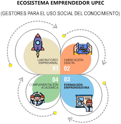 El análisis institucional permitió determinar la configuración del ecosistema emprendedor interno de la UPEC, constituido por cuatro dispositivos: (1) laboratorio empresarial, (2) fabricación digital (FABLAB), (3) complementación académica, y (4) formación emprendedora. Se verificó que el despliegue pedagógico inicial se concentra en los tres primeros semestres, donde se forma al estudiante con pensamiento emprendedor, a través de asignaturas centradas en emprendimiento, vida personal y profesional, políticas públicas, sostenibilidad y resiliencia. Durante esta etapa se refuerzan las “4C” de la formación emprendedora: confianza, comunicación, cooperación y creatividad. Así mismo, se evidenció la capacitación docente para incorporar el enfoque emprendedor en las varias áreas disciplinares, generando un entorno coherente con la filosofía institucional.
