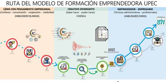 INTRODUÇÃO. A Universidade Politécnica Estadual do Carchi (UPEC) propõe a formação empreendedora como um de seus eixos estratégicos em seu processo formativo, articulando-a com uma abordagem ecológica e contextual. OBJETIVO. Configurar e validar empiricamente as dimensões do perfil empreendedor na formação universitária da UPEC, comparando-as com teorias e demandas do entorno. MÉTODO. A metodologia baseia-se em dois estudos: o primeiro, de natureza correlacional, identificou perfis predominantes orientados para o sucesso como vendedor ou gerente; o segundo, com análise fatorial, validou quatro novas dimensões — decidido, eficaz, sistemático e confiante. Essas características foram posteriormente desenvolvidas por meio da experiência em três disciplinas específicas denominadas Cátedra Empreendedora, utilizando metodologias ativas como Design Thinking e oficinas vivenciais. RESULTADOS. Os resultados evidenciam uma mudança na visão do estudante, que deixa de pensar exclusivamente no emprego para considerar o empreendedorismo como uma opção real e viável. DISCUSSÃO E CONCLUSÕES. Entre os desafios identificados estão a necessidade de fortalecer os filtros de viabilidade empresarial, diferenciar os papéis de formação e potencialização, e consolidar um corpo docente estável e alinhado ao modelo institucional.